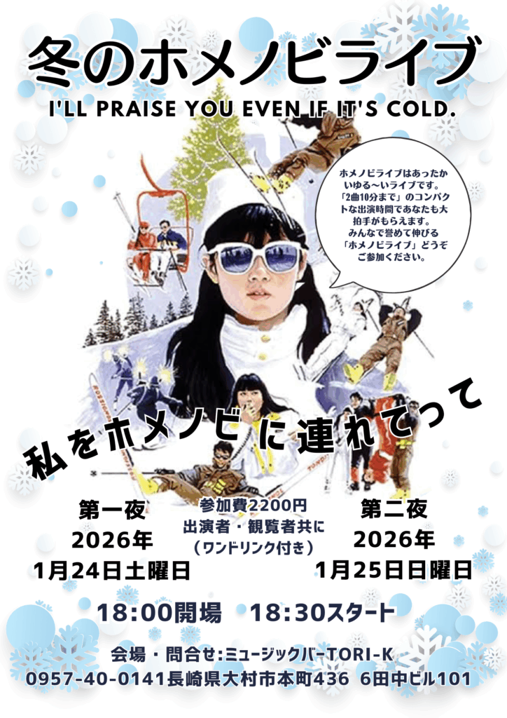 冬のホメノビライブ2026第2夜 2026年1月25日日曜日 18:00オープン 18:30スタート 参加費:2200円(ワンドリンク付き) *出演枠まだまだありますエントリー絶賛受付中です! ホメノビライブエントリーは […]